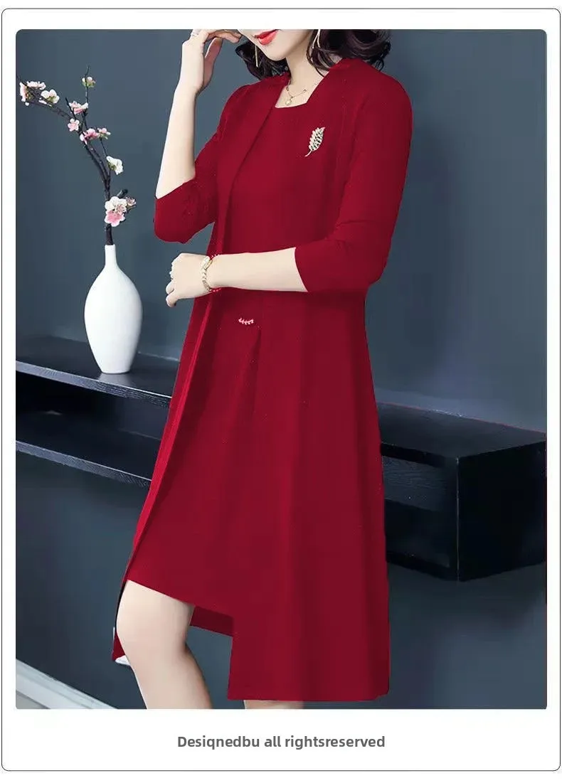 Spring Autumn Two-Piece Set Women's Mid-Aged Mommy Dress Elegant New Style Windbreaker Jacket Female Fashionable Outfit
